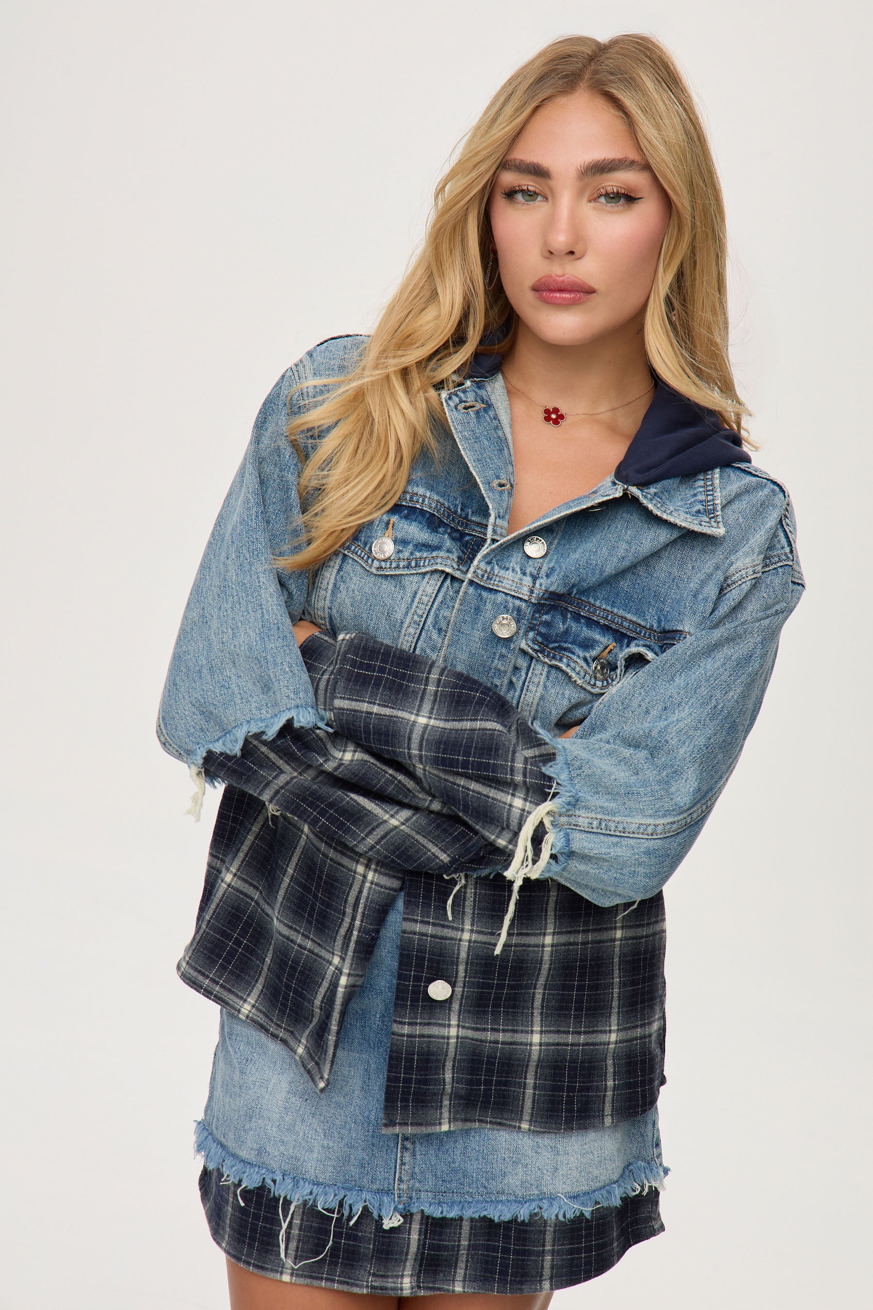 ג'קט ג'ינס עם כובע קפוצ'ון עם סיומת מכופתרת משבצות. לג'קט תיפורים מודגשים, שרוולים ארוכים, 2 כיסי מעטפה וסגירת כפתורים בחזית.