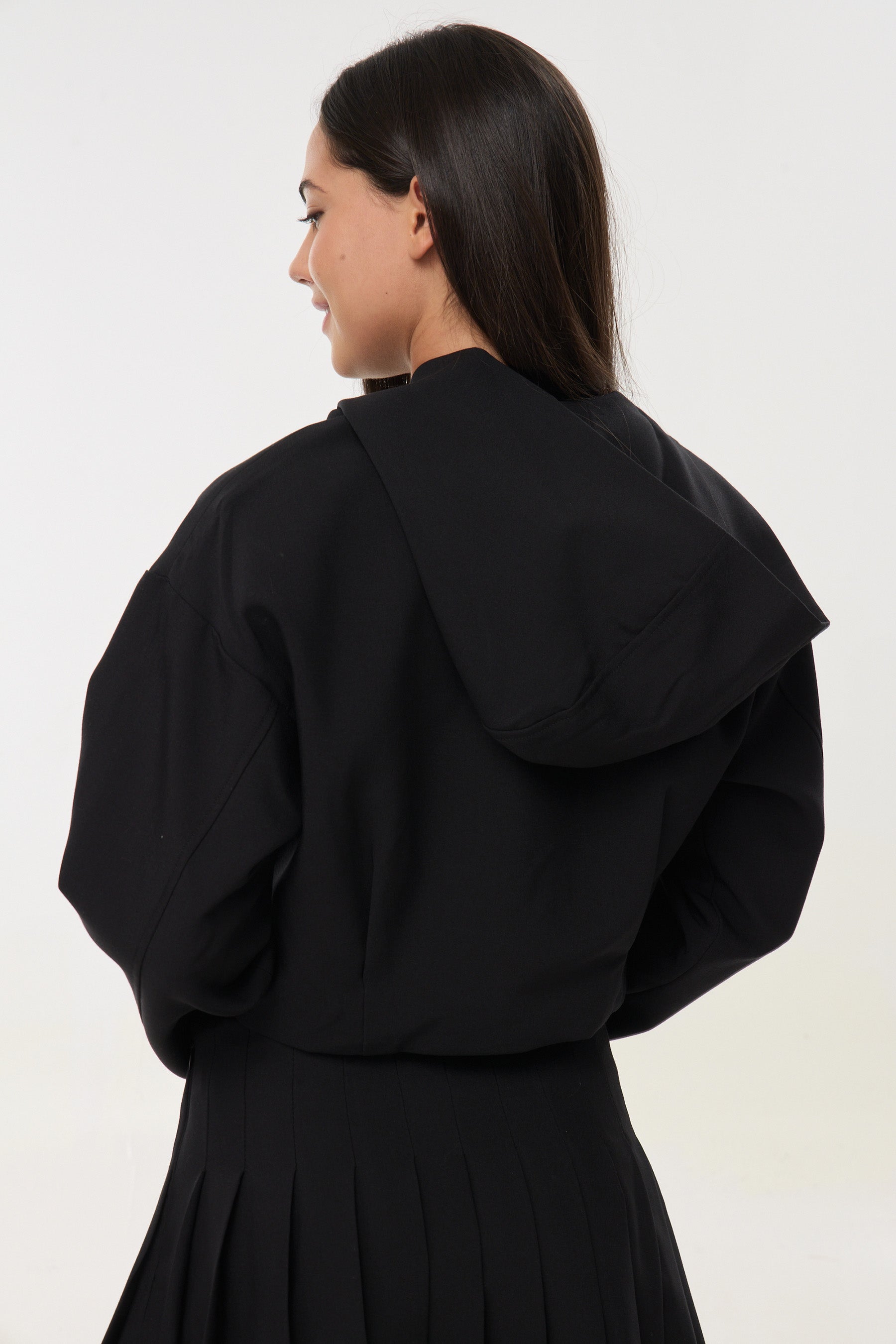 ג'קט בגזרת קרופ משולב כובע קפוצ'ון עם שרוולים ארוכים, 2 כיסים בצדדים וסגירת רוכסן.