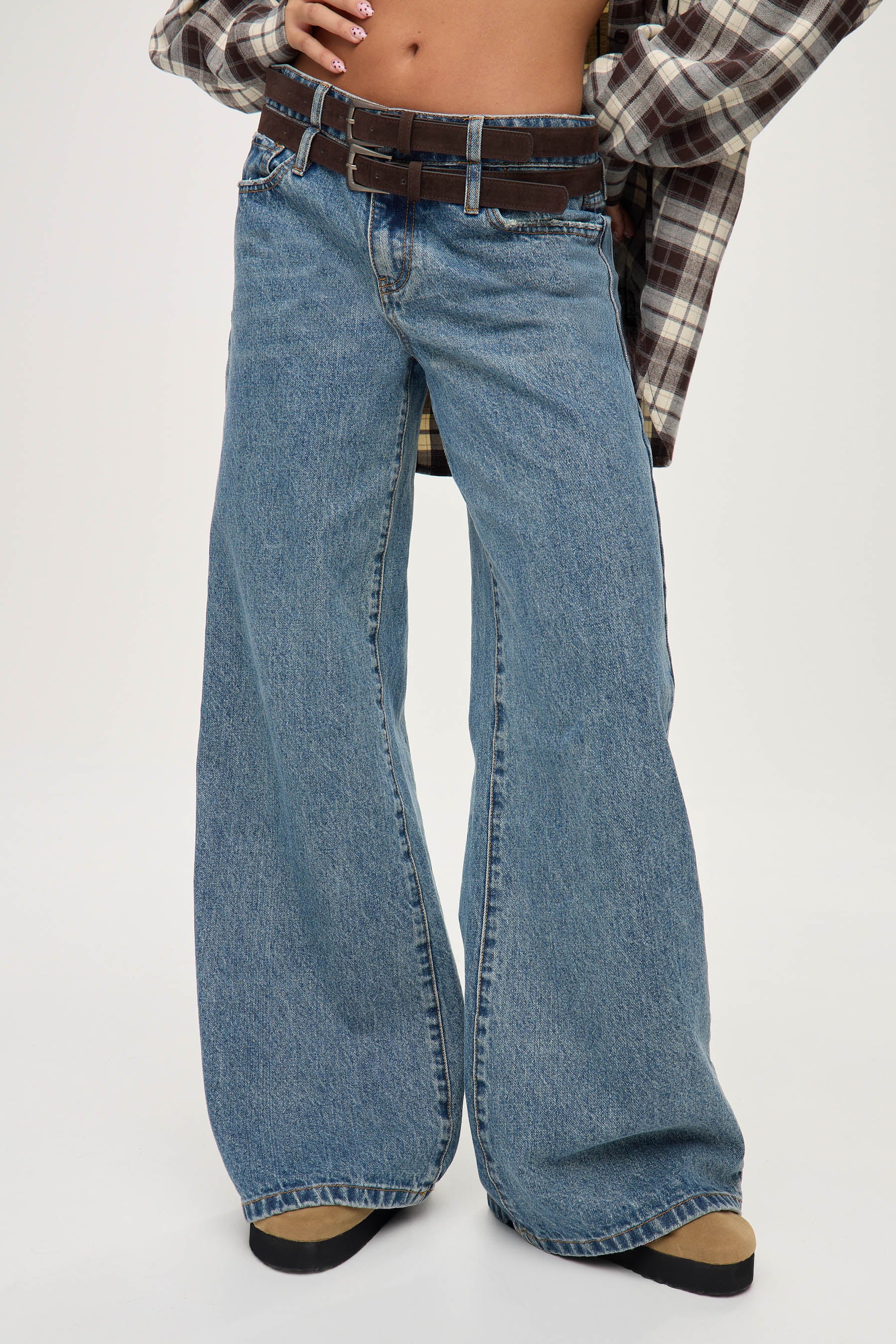 מכנסי ג'ינס ארוכים בגזרה מתרחבת עם חגורת אבזם כפולה במותן, 5 כיסים וסגירה כפתור ורוכסן.