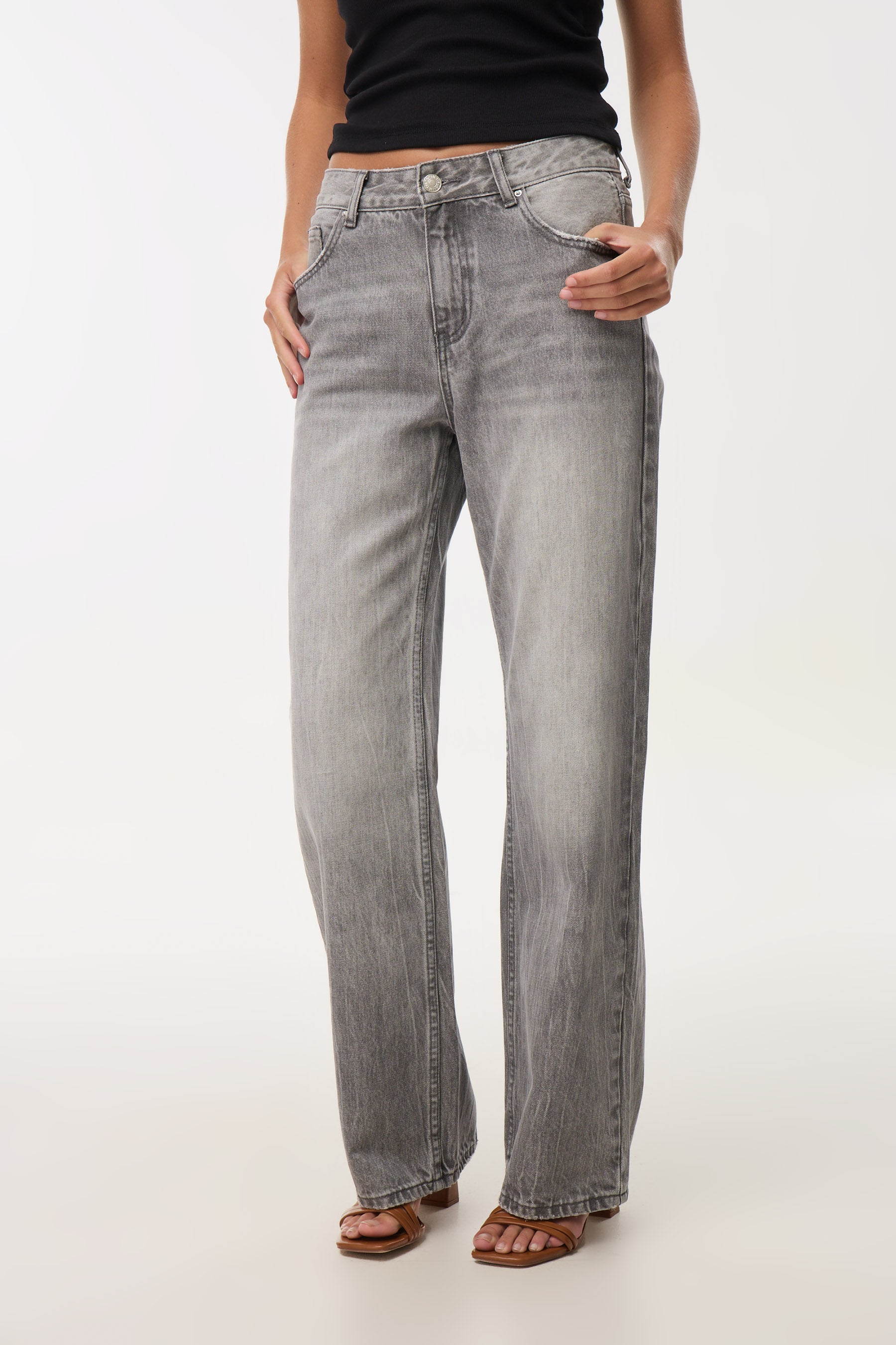 מכנסי ג'ינס ארוכים בגזרה רחבה עם 5 כיסים וסגירת כפתור ורוכסן.