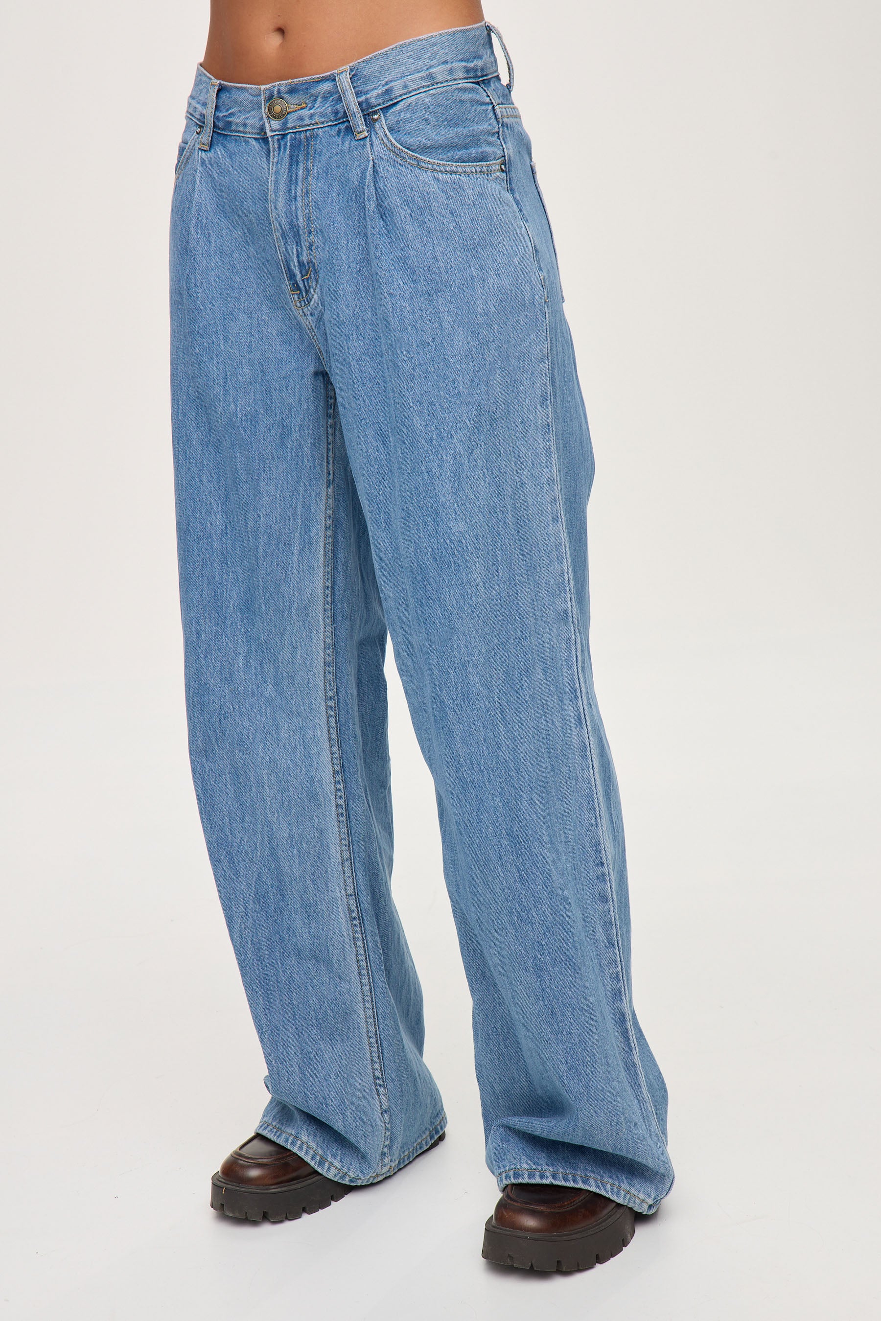 מכנסי ג'ינס ארוכים בגזרה רחבה עם 5 כיסים וסגירה כפתור ורוכסן.