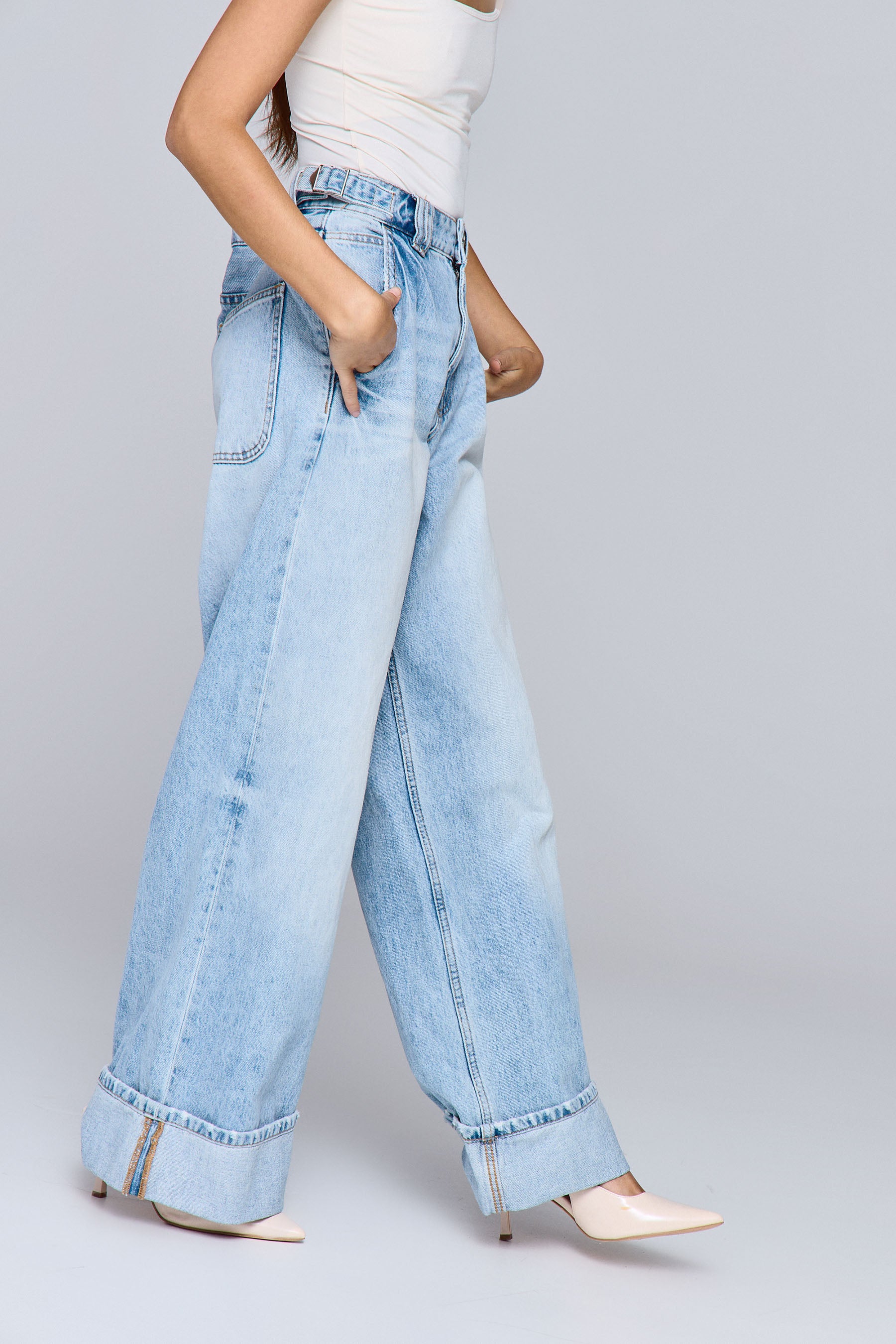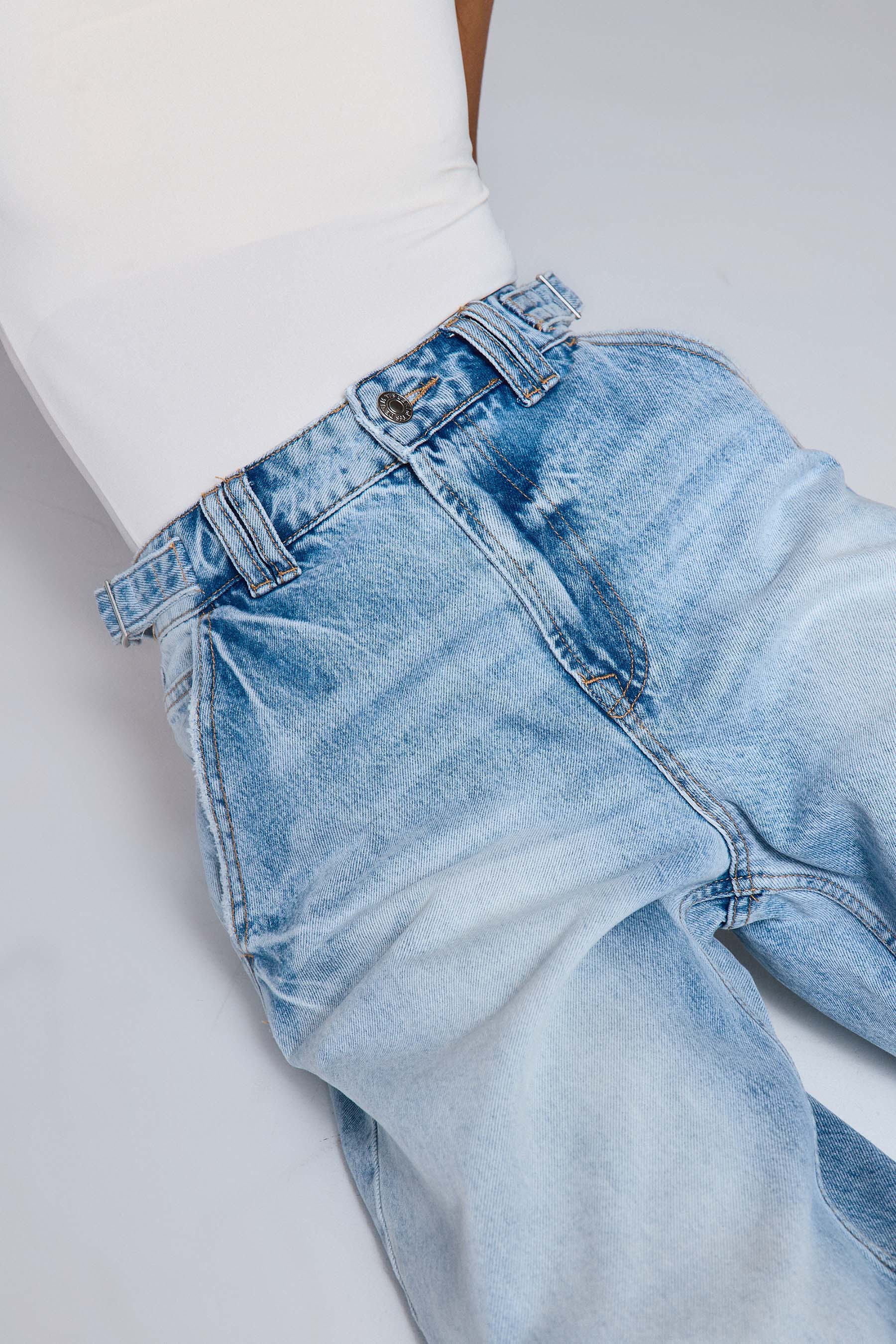 מכנסי ג'ינס ארוכים בגזרה רחבה עם רצועות אבזם בצידי המותן. לג'ינס 4 כיסים וסגירה כפתור ורוכסן.