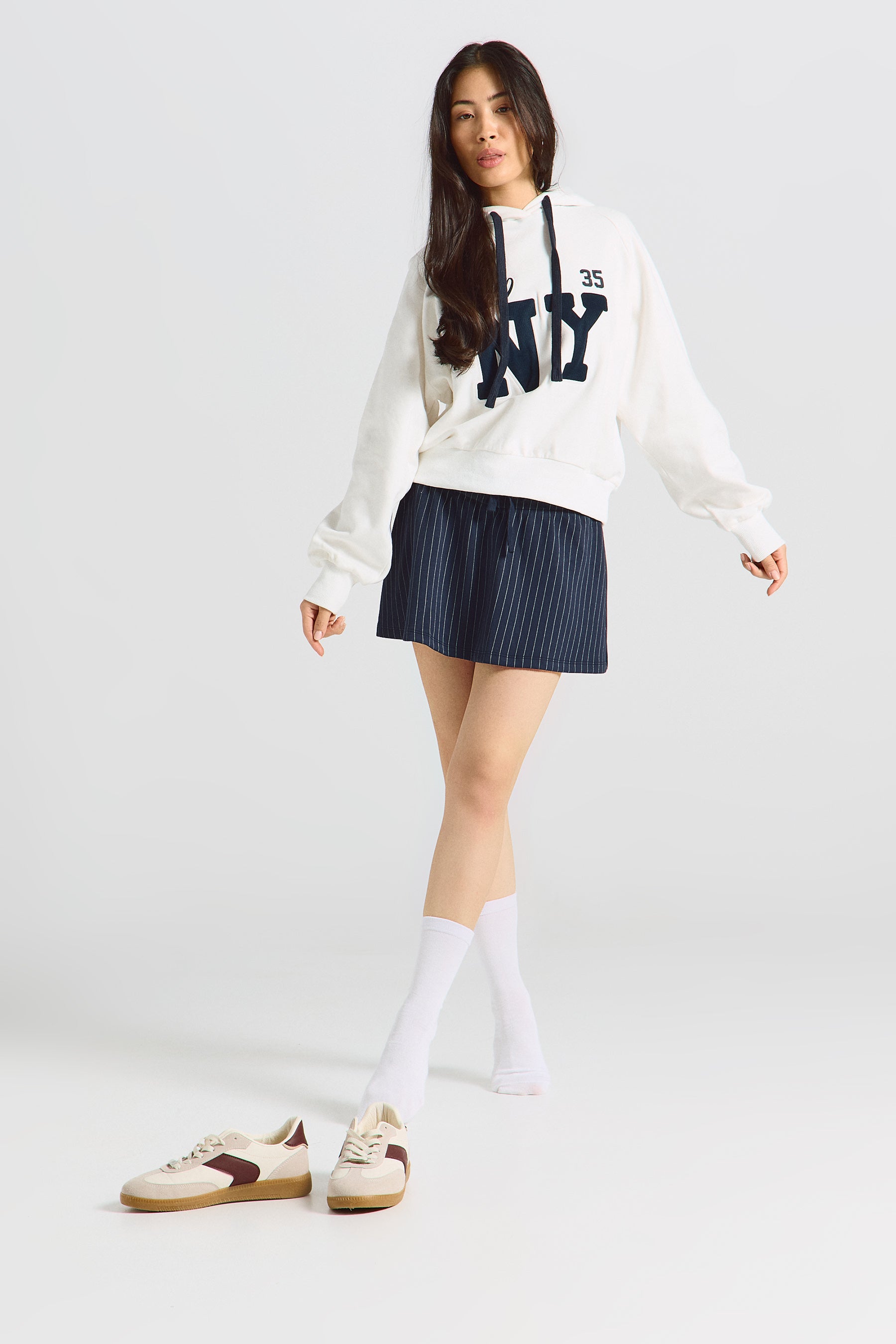חצאית פוטר בגזרת מיני עם גומי משולב שרוכים במותן.