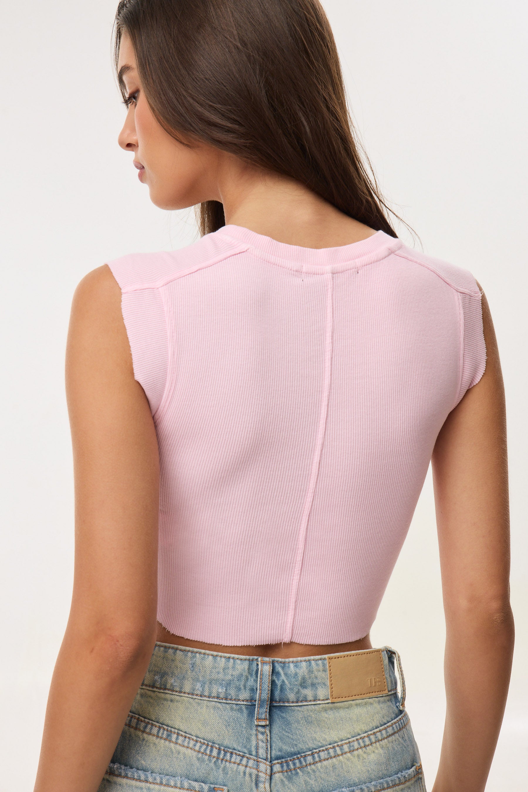 חולצת ריב שטופה בגזרת קרופ עם תיפורים מודגשים ופאץ' בחזית.