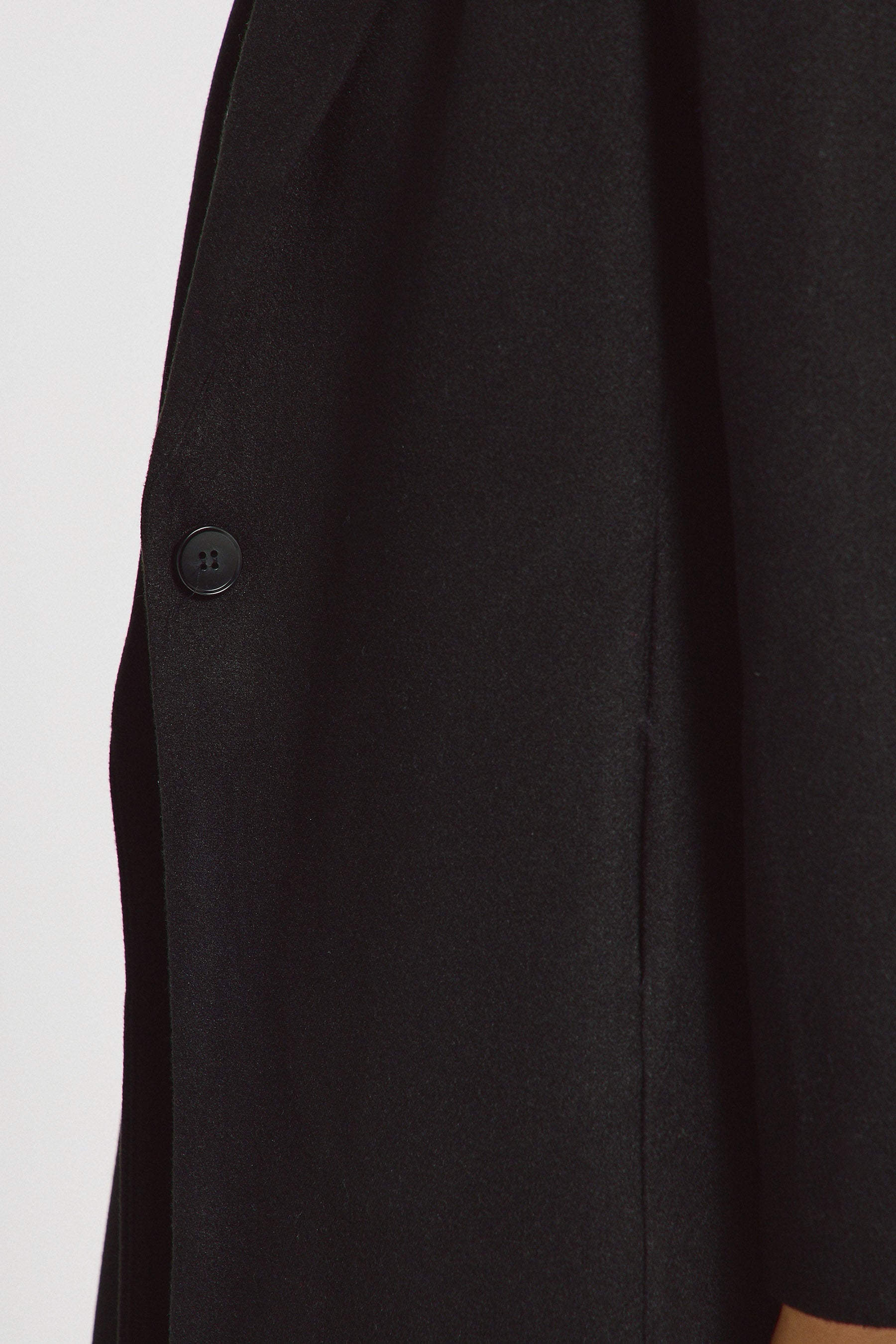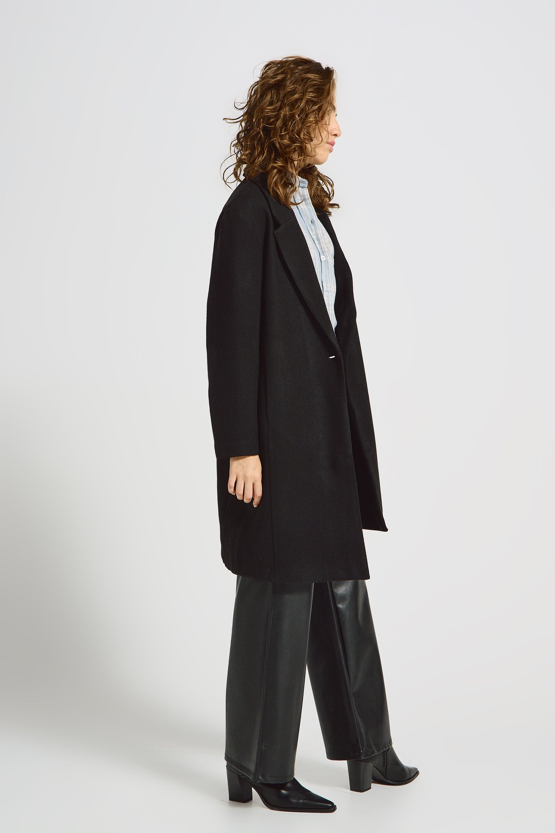 מעיל צמר טרנץ' בגזרת לונג ליין עם שרוולים ארוכים, צווארון שלבים וסגירת כפתור.