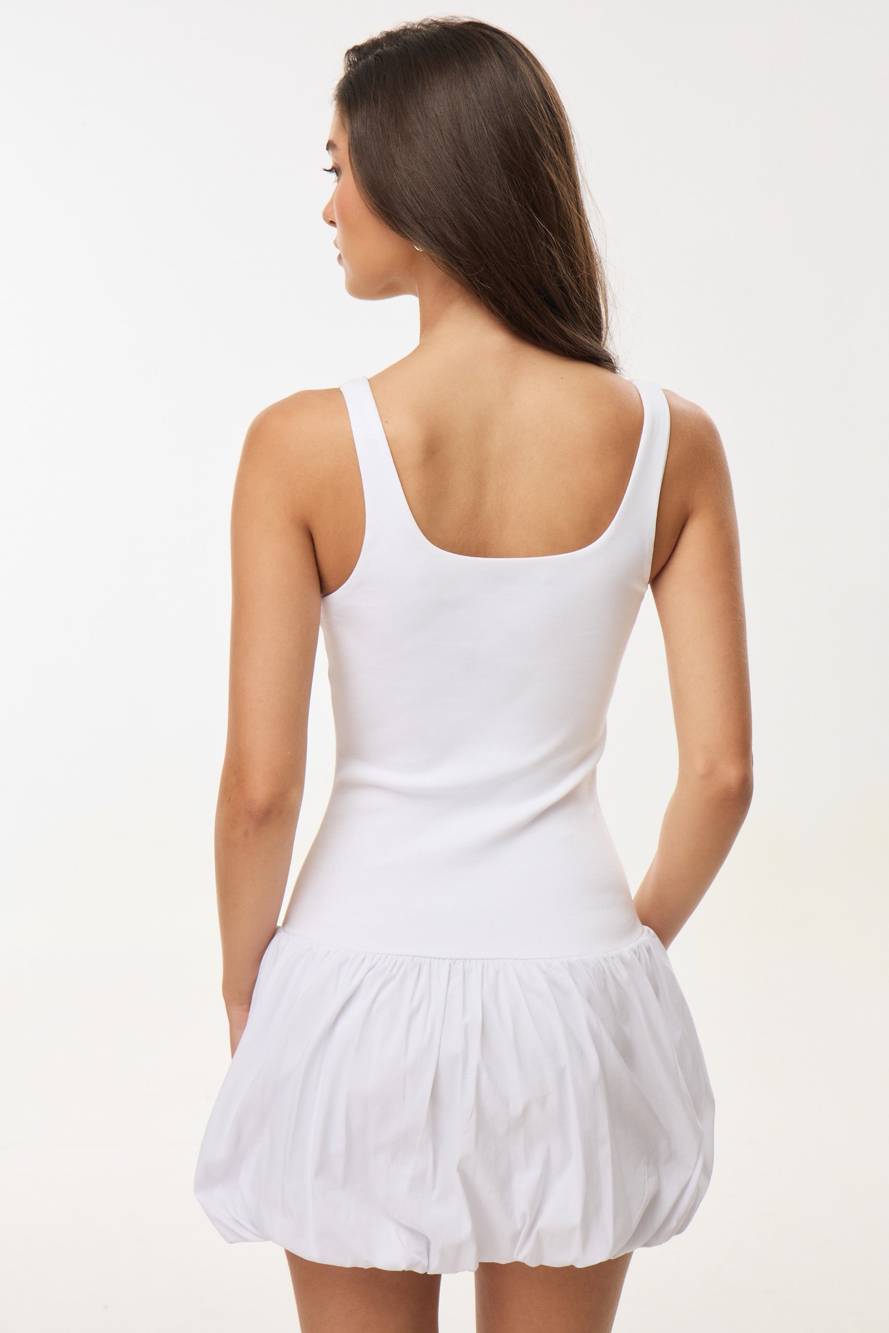 שמלת בלון בצבע לבן בגזרת מיני עם כתפיות ומפתח צוואר מרובע.