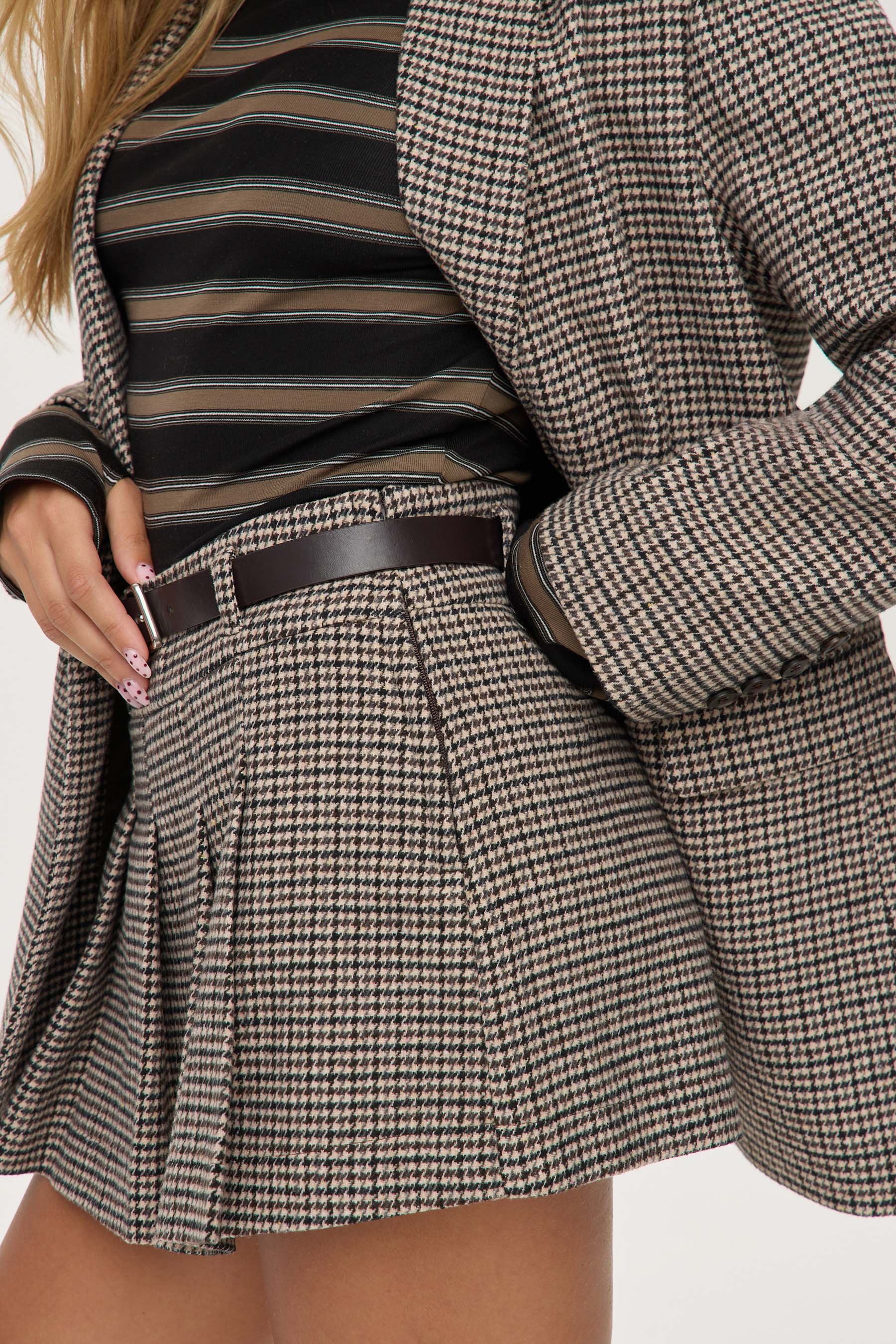 חצאית מבד פפיטה בשילוב מכנסונים. לסקורט קפלים, חגורת אבזם במותו וסגירת רוכסן בצד.