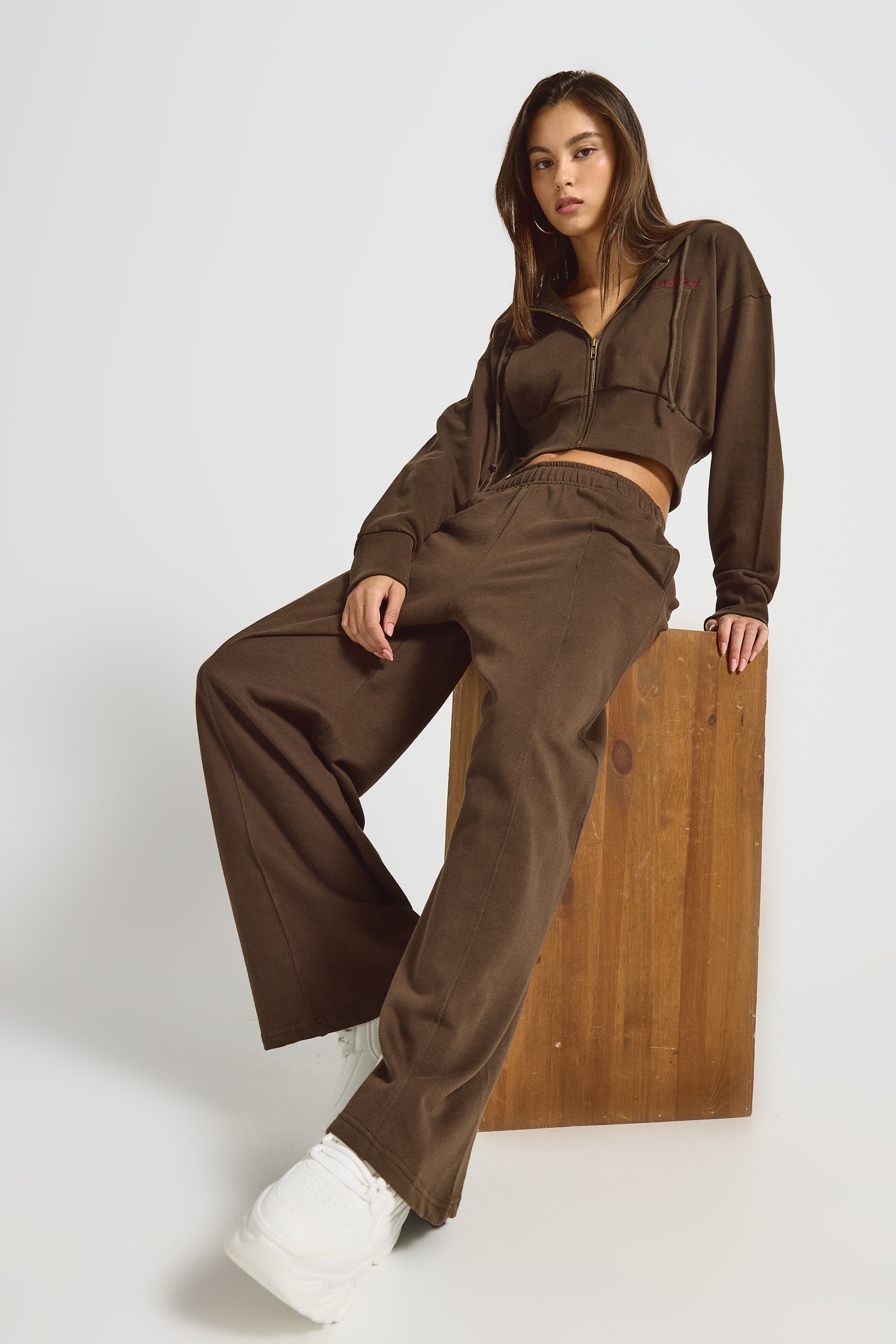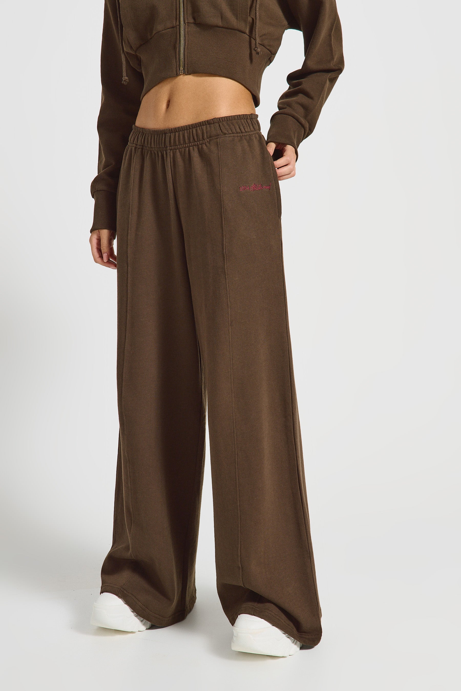 מכנסי טרנינג ארוכים בגזרה רחבה עם גומי במותן, ריקמה וחתכים מקדימה.